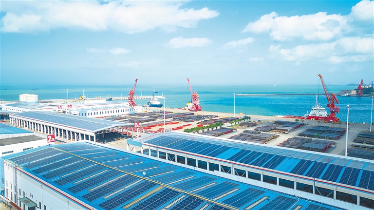 2月10日,俯瞰澄迈马村港光伏电站,码头屋顶有序排列一块块蓝色光伏发电板。据悉,该光伏电站正进一步扩大规模,助力绿色码头的建设,同时加快海上绿色新能源的开发利用,推动能源绿色低碳转型,为实现“双碳”目标注入“绿色动力”。本报记者 袁琛 摄