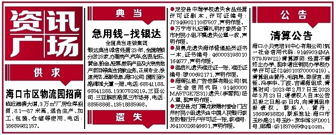 5T9J9W22)清算原因:经营不善终止办学,现申请注销民办学校办学许可证(246010370000419)。清算组由黄丹、毛晓玮、陈彦言、周钰、冯李华、丁波、吉德梅组成,清算时间:2023年2月7日至2023年3月23日,请债权人自本公告见报之日起45日内,向清算组申报债权。联系人:黄丹,18689638826,联系地址:海口市玉沙路21号玉沙·京华城3FD001号,邮箱:451837665@qq.com。