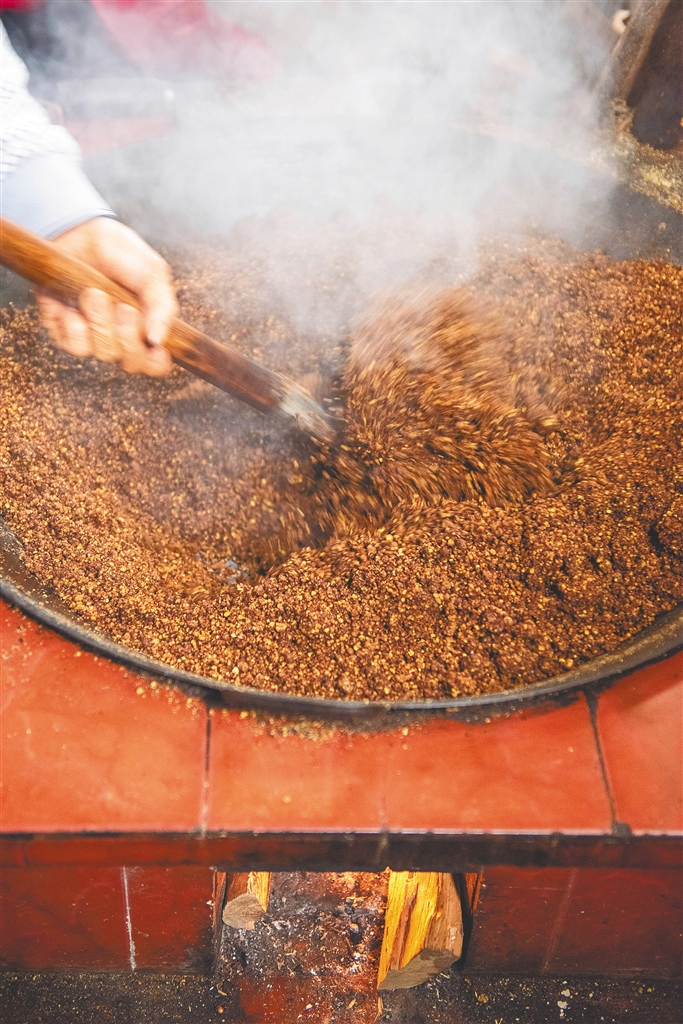 海南油茶的香,正是因为这炒粉方式的不同。在炒粉压榨的过程中,茶籽中的蛋白质发生了微妙变性,与其他成分溶于油中,一同被榨出来,浓烈香味扑鼻而来。