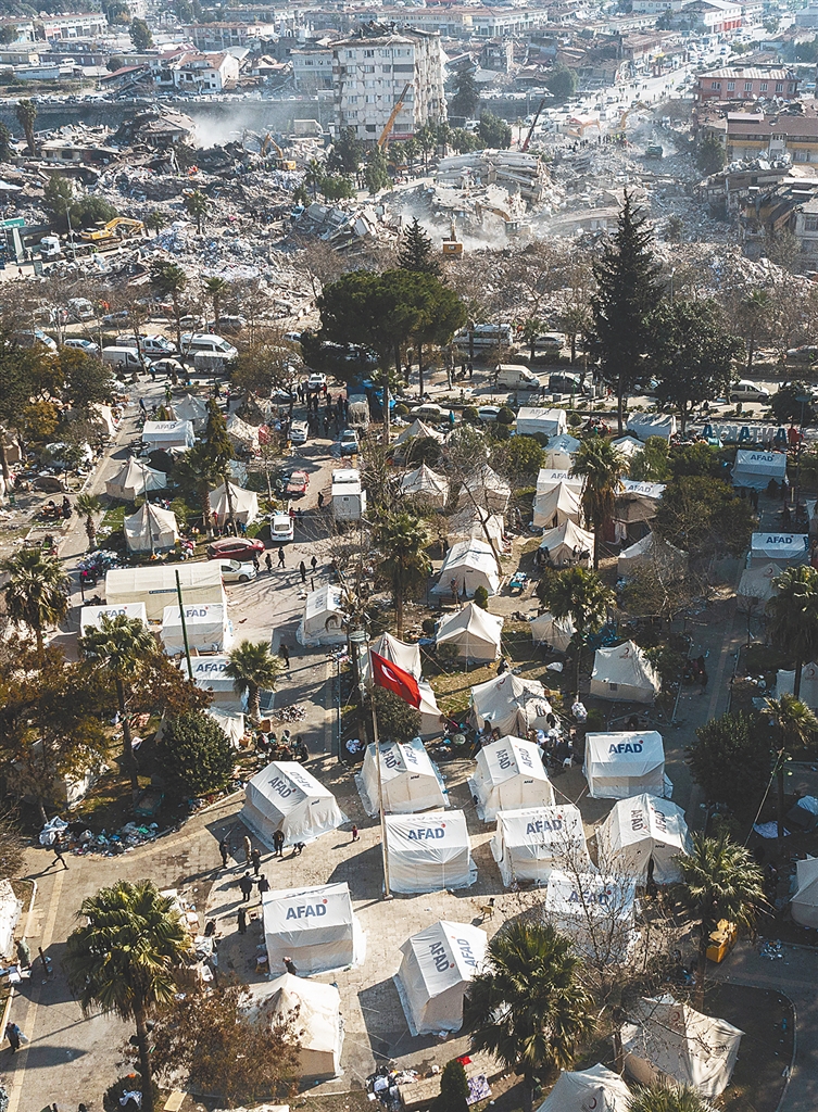 这是2月12日在土耳其哈塔伊省安塔基亚市中心拍摄的地震废墟和救援帐篷。