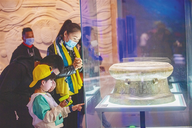 “这面铜鼓的花纹很独特!”陈飞妃对照旁边的文物说明,了解这面铜鼓的历史。鼓面上的太阳纹展示了古人对太阳的崇拜,四周的青蛙装饰图纹则是少数民族特有的图腾纹饰。她笑着对海南日报记者说,“我要把这面精巧的铜鼓‘收入囊中’,将它写到作业里。”