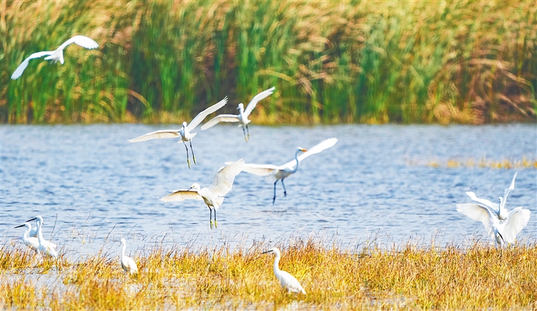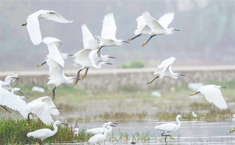 近日,位于昌江黎族自治县海尾湿地公园,成群的鹭鸟在觅食、嬉戏,构成一幅美丽的生态画卷。