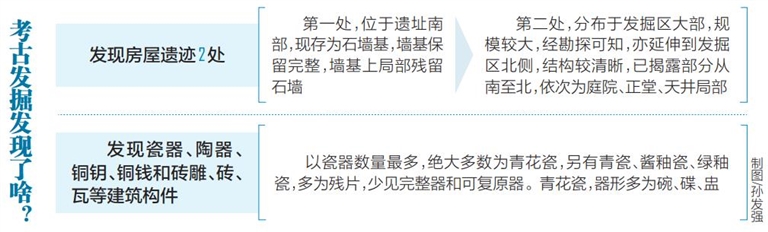 考古发掘发现了啥?全程参与考古发掘的儋州东坡书院管理处主任王圣阳告诉记者,发现房屋遗迹两处。第一处,在遗址南部,现存为石墙基,墙基保留完整,墙基上局部残留石墙,据村民介绍,该处为最近几十年修建房屋。第二处,分布于发掘区大部,规模较大,经勘探可知,亦延伸到发掘区北侧,结构较清晰,已揭露部分从南至北,依次为庭院、正堂、天井局部。
