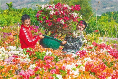 2月17日,在三亚市崖州区三更村三角梅种植基地,技术人员韦少胡(左)和村民杨志献忙着搬运三角梅。
