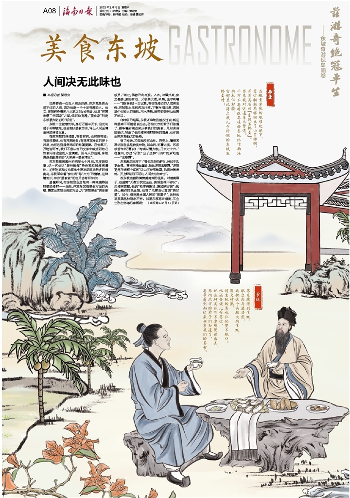 如果要选一位古人同去旅游,苏东坡是再合适不过的人选,因为他是一个十足有趣的人。论文,东坡跻身唐宋八大家之列;论书法,他居“苏黄米蔡”“宋四家”之首,但若论有趣,“美食家”则是东坡最为贴切的“标签”。