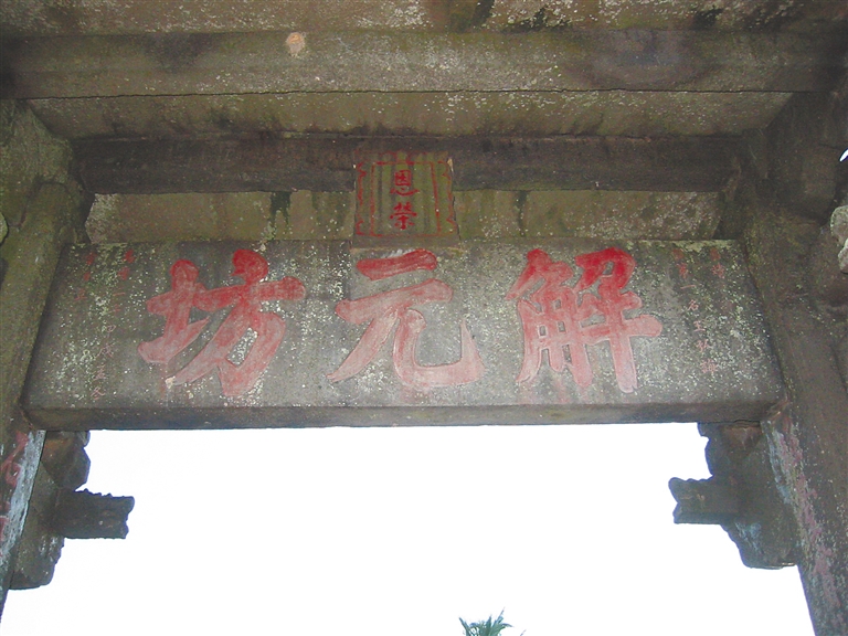 在王弘诲故居左前方,有一座高大庄严的双面石牌坊——“解元坊”和“太史坊”,是后世官员为王弘诲所立,牌坊的石柱上刻有一副行书对联,上联为“石柱擎天秀毓南溟开五指”,下联是“瑶台贯斗光摇北极应三台”,相传为王弘诲的门生、明代著名书法家董其昌的笔迹。