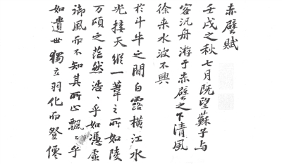在文章方面,苏轼是著名的“唐宋散文八大家”之一。早在21岁参加进士科考试的时候,主考官欧阳修就对他的文章赞赏不已,并感慨“老夫当避路,放他出一头地也”。苏轼的文章内容广泛,将一些前人从未关注到的题材也纳入创作范围。此外,他的文章体裁多样,写景时能像欧阳修一样用寥寥数笔营造出诗的意境,议论时又能像王安石一样言简意赅、鞭辟入里。而且苏轼非常擅长将写景、抒情、议论巧妙地融为一体,写作无固定程式,但又能让意脉贯穿其间,收放自如。其《放鹤亭记》《范增论》《赤壁赋》等皆为中国古代文学珍品。