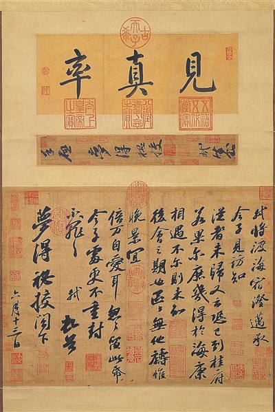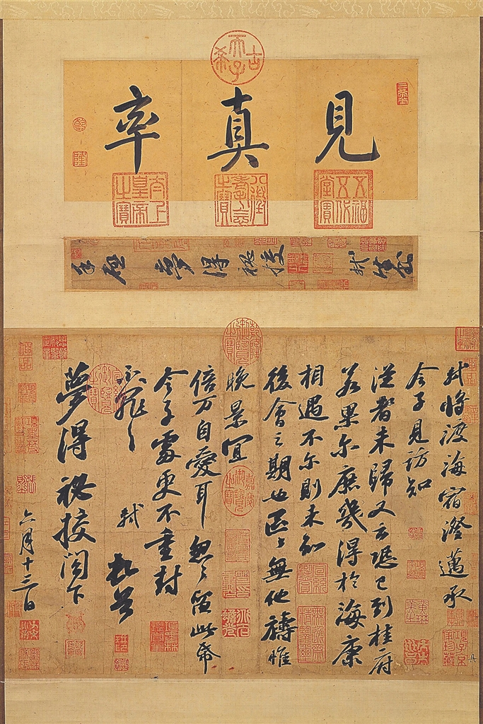 《渡海帖》在清代被收入宫廷,乾隆皇帝盖了不少印章,在引首题有“见真率”三字。帖首和末尾上部两处盖有“神品”印章。老子曰“率性之谓道”,艺术作品最高的境界就是道的境界,就是我们常说的神品。由此可见,乾隆皇帝及历代藏家对此帖评价之高。