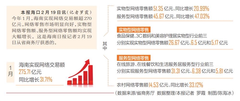 本报海口2月19日讯(记者罗霞)今年1月,海南实现网络交易额超270亿元,网络零售市场明显向好,实物型网络零售额、服务型网络零售额均实现大幅增长。这是海南日报记者2月19日从省商务厅获悉的。