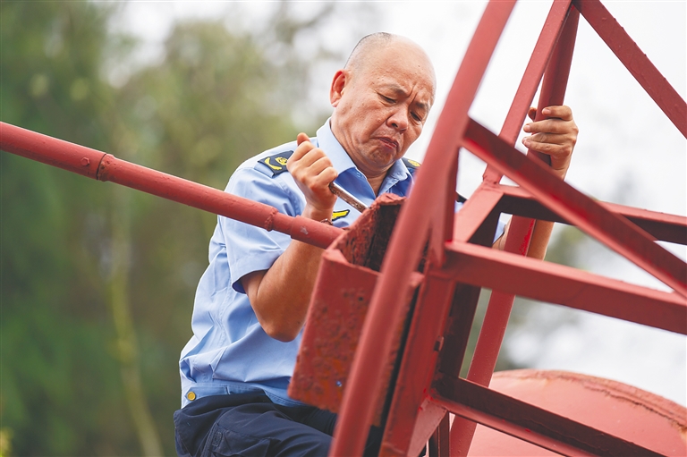 同样是航标工的张贤波是第三代航标工。2月10日,他对临高灯塔进行常规保养,检查航标灯和太阳能设备。他的父亲张秀明艰难地爬上灯塔,在一旁注视着儿子。看到儿子熟练规范的操作,他心中有着赞许。已经是古稀老人的张秀明,也是从岳父手中接过的这份责任。三代人接棒,用他们的认真严谨,擦亮船舶航行的“眼”,守护它们平安出发和抵达。