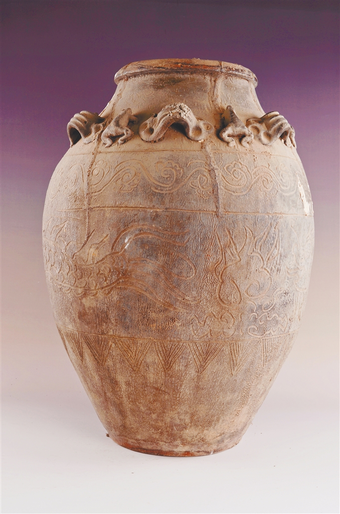 束颈大罐是海南本地最具特色的陶瓷器之一,大罐的颈部常贴塑有水生动物,其中以伏蛙最为多见,在儋州市碗窑村窑址和澄迈县福安窑址考古调查时,就曾发现有贴塑蛙纹的罐类残片。
