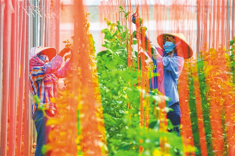 2月21日,三亚市崖州区国家现代农业产业园工作人员在实验大棚中管理新品种甜瓜。