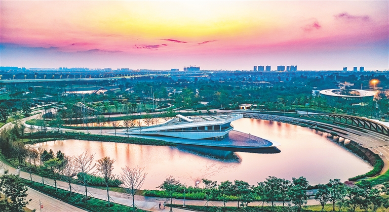 近日,俯瞰晚霞映衬下的海口市西秀公园水上剧场。据悉,西秀公园是一座城市生态综合公园,建有雨林之心、水上剧场、儿童乐园、篮球场、足球场等设施,为海口城市空间提质添彩,助力打造宜居生活。本报记者 陈元才 摄