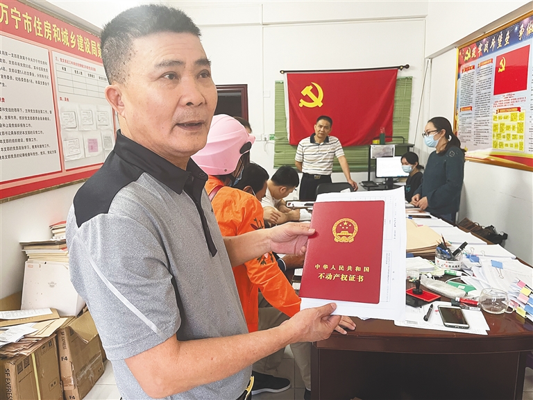 “住了10年的房子终于办证了。”2月14日,在万宁市住建局,万城镇阳光小区一区安置户蔡先生办出不动产权证书,喜不自禁地说:“开心!”