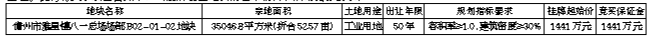 (三)该宗地建设严格按照省装配式相关要求执行,竞得人竞得土地后,如造成地块闲置的,按照《海南自由贸易港闲置土地处置若干规定》处置。三、净地情况:该宗地属国有存量建设用地,存有地上构筑物,四至界线清楚、面积准确、土地权利清晰、安置补偿落实到位、无法律经济纠纷、土地开发利用规划条件明确、符合土壤环境质量要求;该宗地周边可以满足施工建设所需的水、电供应,相关设备、机械可以进场施工,具备动工开发所必需条件。经我局核查,该宗地不存在违法占地和违法建设情况。四、地价评估情况:该宗土地评估价格为411元/平方米(折合27.4万元/亩),总价为1440.4235万元。五、竞买申请:(一)竞买人资格。根据儋州市科技和工业信息发展局发展要求,该地块用于发展低碳制造业,竞买人需具备以下条件:1.中华人民共和国境内外的自然人、法人和其他组织(除法律、法规另有规定外)均可申请报名参加竞买;2.不接受联合体竞买;申请参加竞买者须提出书面竞买申请,并提供《竞买须知》中要求提供的相关文件;3.同一竞买人只能提交一次竞买报名(同一法定代表人视为同一名竞买人,报名名称与缴纳竞买保证金账户名称必须一致)。具有下列行为的自然人、法人和其他组织不得参加本次土地挂牌出让活动:(1)在儋州市范围有拖欠土地出让金行为,至今尚未付清的;(2)在儋州市范围内有闲置土地、低效利用土地、未按土地出让合同约定动工开发的、擅自改变土地用途等违法行为、未及时纠正的;(3)被人民法院列入失信被执行名单和被税务系统列入重大税收违法案件联合惩戒名单的企业法人和个人。(4)根据海南省自然资源和规划厅《关于加强土地供应竞买人资格审核的通知》(琼自然资函〔2020〕1753号)文件规定,原非法占地、违法建设行为人。(二)交易资料获取方式。本次挂牌出让的详细信息和具体要求,见挂牌出让手册及其他相关文件。手册和文件可从海南省建设用地使用权和矿业权网上交易系统(以下简称网上交易系统,网址:http://lr.hainan.gov.cn:9002)查看和打印。(三)竞买申请方式:本次交易活动竞买申请环节采取线下方式进行,有意向的竞买人按挂牌出让手册的具体要求报名参加竞买。不接受电话、邮寄、口头等其他形式的申请。竞买申请地点:儋州市自然资源和规划局。竞买申请时间:2023年2月24日08:30至2023年3月24日17:00(北京时间)。(四)竞买保证金:竞买人报名参加竞买时,须在公告规定的时间内按照挂牌出让手册的有关规定将竞买保证金1441万元存入儋州市自然资源和规划局指定的账户,竞买保证金在账户期间不计利息。本次竞买保证金的币种为人民币,不接受外币。缴纳的竞买保证金应不属于银行贷款、股东借款、转贷和募集资金所得,并出具承诺。竞得人缴纳的竞买保证金转为土地出让金,未竞得者缴纳的竞买保证金在挂牌活动结束后5个工作日内予以退回,不计利息。竞得者违约反悔的,竞买保证金不予退还。根据海南省自然资源和规划厅《关于海南省土地交易市场竞买保证金可使用银行保函的通知》(琼自然资规〔2022〕7号)规定,该宗地可采用银行保函方式提供竞买保证金。使用银行保函方式提供土地竞买保证金的,保函应为不可撤销、见索即付保函,担保金额应不少于全额土地竞买保证金,保证期限自保函开立之日起至挂牌交易活动结束后不少于60日;纸质保函需在竞买保证金到账截止时间前2个工作日送达。竞买保证金到账截止时间为:2023年3月24日17:00(北京时间)。(五)资格确认:经审核,竞买申请人符合竞买资格,且竞买保证金已按要求缴纳的或已按照规定提供银行保函的,儋州市自然资源和规划局将发放《竞买资格确认书》,确认其获得竞买资格。竞买资格审核时间:2023年2月24日08:30至2023年3月24日17:30。六、挂牌报价时间及地点:(一)本次挂牌报价竞价环节采取线下方式进行,获得竞买资格的竞买人应按挂牌出让手册的具体要求参与报价竞价活动。挂牌报价阶段仅接受书面报价,不接受电话、邮寄、电子、口头等其他方式报价。挂牌截止由挂牌主持人主持确定。(二)挂牌报价时间:2023年3月17日08:30至2023年3月27日11:00,受理报价时间为北京时间工作日08:30至11:30及14:30至17:30。(三)挂牌报价地点:儋州市自然资源和规划局。(四)挂牌现场会地点:海南省公共资源交易服务中心二楼土地矿产资源交易厅。七、其他需要公告的事项:(一)本次国有建设用地使用权按土地现状和地上构筑物整体挂牌出让,地上构筑物为钢筋混凝土及钢结构建筑,面积约21198平方米(具体以实测为准),竞得人在竞得土地后自行处置地上构筑物并按规定完善相关手续。(二)本次国有建设用地使用权挂牌出让设有底价,按照价高且不低于底价者得的原则确定竞得人。(三)竞买人竞得土地后应当场与儋州市自然资源和规划局签订《挂牌出让成交确认书》,并在10日内与儋州市自然资源和规划局签订《国有建设用地使用权出让合同》的同时和海南省儋州市科技和工业信息发展局签订《儋州市产业项目发展和用地准入协议》。(四)本次挂牌出让事项如有变更,以届时变更公告为准。本公告未尽事宜详见《儋州市国有建设用地使用权挂牌出让手册》,该手册所载内容为本公告的组成部分。(五)由竞得人根据拍卖法及海南省有关规定支付相关交易服务费。联系人:杨先生;联系电话:0898-2