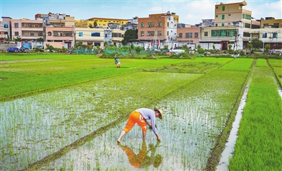 2月23日,在海口市秀英区长流镇文毓村,村民正忙着插秧施肥。(右图)