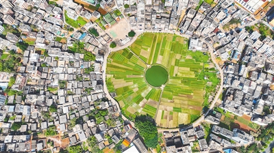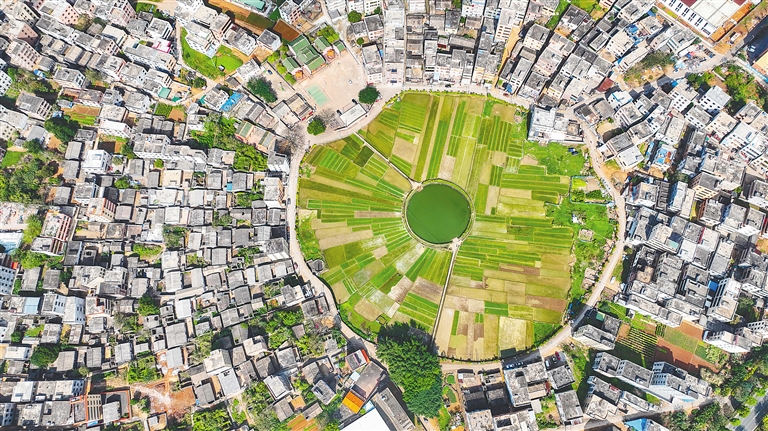 据了解,文毓村产业以农业为主,种植水稻以及一些经济作物。这座有着400多年历史的村庄,在村子中心人工挖出了面积约2亩的水塘,40多亩的水稻环绕一周,形成美丽的圆形。