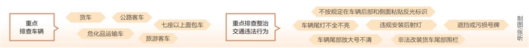 专项行动期间,各地公安交管部门将深入国省道及重点农村公路、高速公路出入口及服务区、城市主要出入口、道路运输企业(场站)、物流园区、施工工地等重点区域,紧盯货车、危化品运输车、公路客车、旅游客车和七座以上面包车等重点车辆,重点排查整治不按规定在车辆后部和侧面粘贴反光标识、车辆尾灯不全不亮、违规安装后射灯、车辆尾部放大号不清、遮挡或污损号牌、非法改装货车尾部围栏等交通违法行为。
