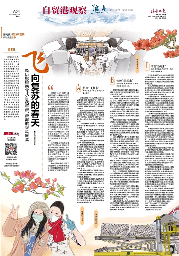 新冠疫情三年,对航空运输业冲击甚大,期间,海南本土航空企业——海航航空集团更是经历了破产重整,但在省委省政府关心下,在控股股东方大集团支持下,海航航空集团聚焦主业,凝心聚力,抓住疫情防控调整的契机,借力海南自贸港建设东风,加快恢复国内国际航线,今年1月更是实现了近5年同月份首次经营性盈利。本报今起推出“新海航·何以入云霄”系列报道,聚焦展翅“飞”向复苏春天的新海航,探秘其如何为游客提供高质量服务,在自贸港建设中抢抓新机遇、展现新作为,敬请垂注。