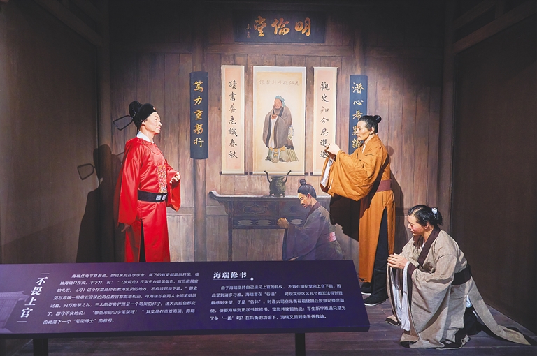海瑞展览馆有上下两层,分为海瑞生平展展区、清官文化长廊及廉洁文化厅三个部分。一楼展厅两侧是浮雕墙,以《明史·海瑞传》为底纹的“书卷”上刻有八字箴言——刚正不阿、清正廉洁,这八个字点明了海瑞精神的内核及展览馆的主旨。海瑞生平展分为九个部分,多处采用复原场景的表现形式,帮助观展者跨越时空,更加直观地了解海瑞的事迹和品格。