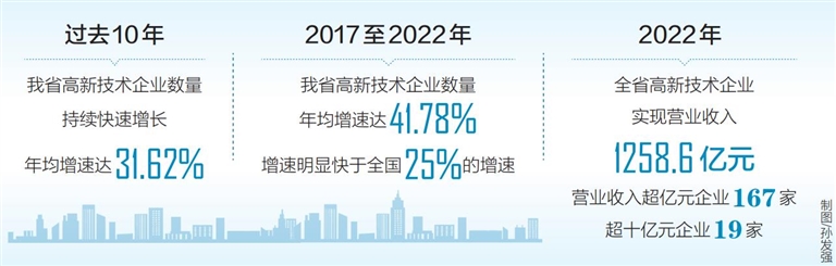 《报告》指出,过去10年,我省高新技术企业数量持续快速增长,年均增速达31.62%。2017至2022年,我省高新技术企业数量年均增速达41.78%,增速明显快于全国25%的增速,且呈逐年加速发展态势。