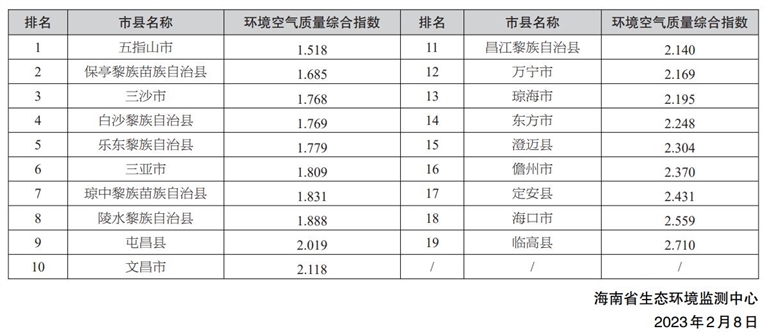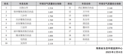 环境空气质量排名靠前的市县分别是五指山市、保亭黎族苗族自治县和三沙市,排名靠后的市县分别是临高县、海口市和定安县。2023年1月全省19个市县环境空气质量排名如右: