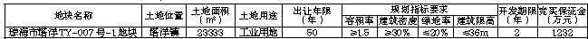 根据琼海市人民政府《净地条件核定表》,琼海市塔洋TY-007号-1地块土地权利清晰、安置补偿落实到位、地上附着物清表、无法律经济纠纷、土地开发利用规划条件明确、符合土壤环境质量要求、具备动工开发所必需条件。按照《海南省自然资源和规划厅、海南省发展和改革委员会、海南省农业农村厅、海南省工业和信息化厅、海南省商务厅、海南省财政厅、国家税务总局海南省税务局关于印发〈海南省产业用地控制指标〉的通知》(琼自然资用〔2023〕12号)有关规定,此宗地参照工业用地产业项目(专用设备制造业)设定控制指标,投资强度指标为240万元/亩,年度产值指标为350万元/亩,年度税收指标为30万元/亩,项目约定达产时间为签订《国有建设用地使用权出让合同》后的3年内。以上控制指标和达产时间按规定列入《产业项目发展和用地准入协议》,属于协议内容的组成部分,竞得人应严格履行协议内容。该宗土地项目应采用装配式建造方式建设,按装配式建筑有关规定执行。二、竞买要求及条件:(一)中华人民共和国境内外的自然人、法人和其他组织均可申请参加(除法律法规另有规定外),仅限单独申请,不接受联合申请(注:失信被执行人不得参加本次竞买)。(二)本次国有建设用地使用权挂牌出让设有底价,按照报价最高且不低于底价的原则确定竞得人。(三)竞买保证金可以现金方式支付,也可以使用银行保函方式缴纳。使用银行保函方式提供竞买保证金的,应符合海南省自然资源和规划厅《关于海南省土地交易市场竞买保证金可使用银行保函的通知》(琼自然资规〔2022〕7号)有关规定。(四)申请人竞得土地后,拟成立项目公司进行开发建设的,竞得人在项目公司中出资比例不得低于50%(不含50%)。(五)竞得人在签订《挂牌成交确认书》之日起5日内,由竞得人成立的项目公司或竞得人与琼海市科学技术工业信息化局签订《产业项目发展和用地准入协议》,并在签订《产业项目发展和用地准入协议》后与琼海市自然资源和规划局签订《国有建设用地使用权出让合同》,依法办理土地登记手续。三、申请人可于2023年2月28日至2023年3月29日到琼海市土地储备整理交易中心(或海南省公共资源交易服务中心一楼受理大厅3号窗口)查询和获取挂牌出让文件。也可从海南省建设用地使用权和矿业权网上交易系统(以下简称网上交易系统,网址:http://lr.hainan.gov.cn:9002)查看和打印。四、申请人可于2023年2月28日至2023年3月29日到琼海市土地储备整理交易中心提交书面申请,交纳竞买保证金的到账截止时间为2023年3月29日17时。提供纸质保函方式缴纳竞买保证金的送达截止时间为2023年3月27日17时。经审查,申请人按规定交纳竞买保证金,具备申请条件的,我局将在2023年3月30日17时前确认其竞买资格。五、本次国有建设用地使用权挂牌出让地点:海南省政府会展楼二楼省公共资源交易服务中心土地交易厅,挂牌时间为:(一)起始时间:2023年3月20日 8时30分。(二)截止时间:2023年3月31日15时。六、其他需要公告的事项:(一)本次挂牌出让实施机构为琼海市土地储备整理交易中心,详细情况请登录:http://www.landchina.com;http://zw.hainan.gov.cn/ggzy/;http://Ir.hainan.gov.cn/。本次挂牌事项如有变更,将在以上网站公告,届时以变更公告为准。(二)本次挂牌出让竞买报价只接受书面报价,不接受电话、电子邮件、口头等方式报价,节假日不受理报名、报价。七、联系方式:联系地址:琼海市金海路233号;联系电话:0898-62811911;联系人:蔡先生。八、本公告未尽事宜,详见挂牌出让文件,该文件所载内容为本公告的组成部分。