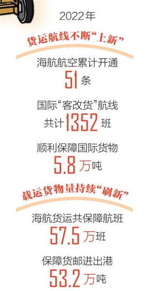 货运航线不断“上新”——2022年,海航航空集团旗下海南航空、天津货运航空等又相继开通海口⇌悉尼、新加坡⇌三亚⇌广州、海口⇌哈恩等货运航线;全年累计开通51条国际“客改货”航线,共计1352班,顺利保障5.8万吨国际货物,其中海南地区开通“客改货”航线3条,有效激活海南地区国际物流市场活力。
