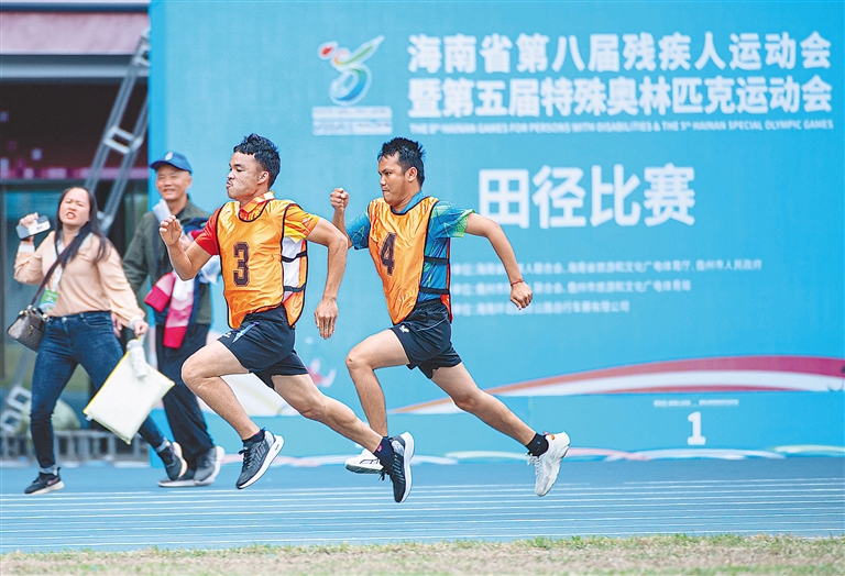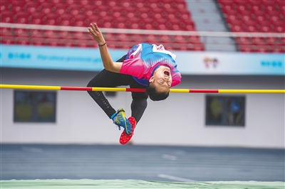 3月1日,省残运会第二天,在儋州市体育中心,运动员在比赛中奋勇拼搏。上图为运动员在跳高比赛中奋力起跳越过横杆。右图为运动员竭力奔跑,向终点冲刺。本报记者 袁琛 摄