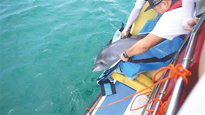 去年4月7日,这只海豚搁浅在昌江棋子湾,受伤严重,奄奄一息,被众人送往海花岛海洋生物科研基地接受科学救助。