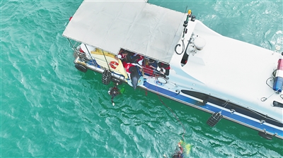 接近11时20分,渔政船开始返航,原本阴沉的天气忽然放晴,碧蓝的大海上波光粼粼。