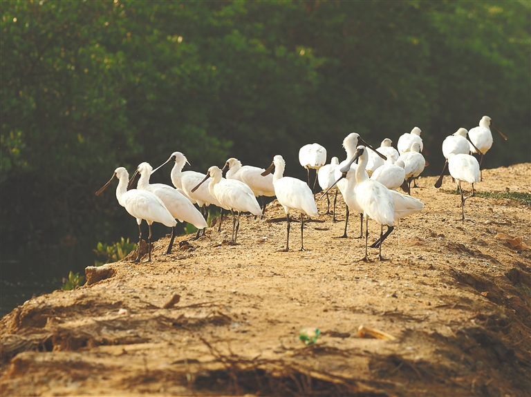 “瞧,那就是黑脸琵鹭,咱们湿地数量最多的‘国宝’。” 3月2日上午,在儋州新盈红树林国家湿地公园,顺着护林员王世何指的方向,湿地公园的生境塘内一群“黑脸”的鸟儿映入眼帘,“扎堆”在滩涂上玩耍打闹。和国宝大熊猫一样,全球濒危鸟类黑脸琵鹭也是国家一级重点保护野生动物,被称为鸟中“国宝”。
