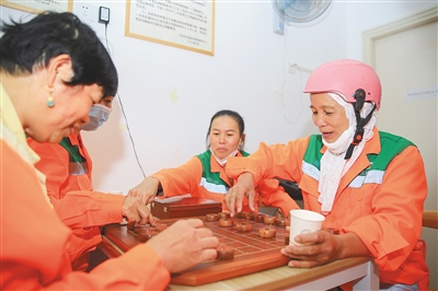 图② 3月2日,工作间隙,环卫工人在暖“新”驿站休憩、下棋。本组图片均由本报记者 王程龙 摄