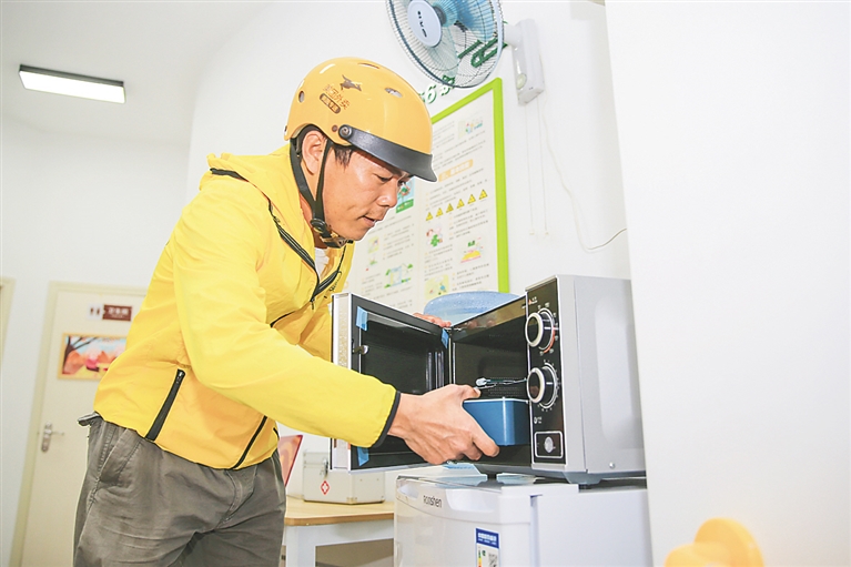 图① 3月2日,在三亚市天涯区党群服务中心的暖“新”驿站,外卖小哥利用微波炉热饭。