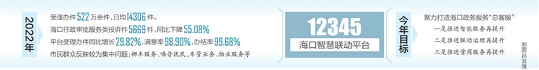 本报海口3月3日讯 (记者张期望)3月3日上午,12345海口智慧联动平台2022年大数据分析与运用通报会在海口市民游客中心报告厅举办。2022年,该平台受理办件522万余件,日均14306件。海口行政审批服务类投诉件5669件,同比下降55.08%。