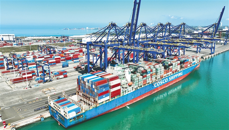 图①:1月13日,在洋浦经济开发区国际集装箱码头,轮船停靠在泊位装卸货物。