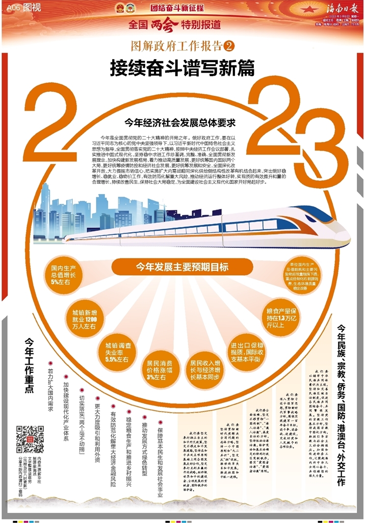 今年是全面贯彻党的二十大精神的开局之年。做好政府工作,要在以习近平同志为核心的党中央坚强领导下,以习近平新时代中国特色社会主义思想为指导,全面贯彻落实党的二十大精神,按照中央经济工作会议部署,扎实推进中国式现代化,坚持稳中求进工作总基调,完整、准确、全面贯彻新发展理念,加快构建新发展格局,着力推动高质量发展,更好统筹国内国际两个大局,更好统筹疫情防控和经济社会发展,更好统筹发展和安全,全面深化改革开放,大力提振市场信心,把实施扩大内需战略同深化供给侧结构性改革有机结合起来,突出做好稳增长、稳就业、稳物价工作,有效防范化解重大风险,推动经济运行整体好转,实现质的有效提升和量的合理增长,持续改善民生,保持社会大局稳定,为全面建设社会主义现代化国家开好局起好步。