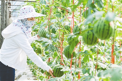 在试验大棚内,各式各样的西瓜采用立体吊蔓的方式种植,徐志红在蔓丛中穿梭,只见她手握剪刀,麻利地剪下一个个圆滚滚的西瓜。“每个品种的口感都不一样,各有特色,大家都来尝尝,也给我们提点意见。”不一会儿,她抱着几个小皮球大小的西瓜走出来,热情地招呼到访的客人品尝。