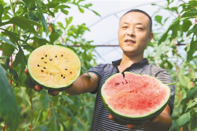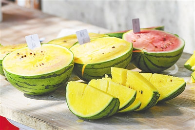 说话间,徐志红切开一个果皮上分布着深绿色锯齿条带的西瓜,露出黄红双色瓤。她介绍:“这是‘美颜’西瓜,因纵切剖面像一道彩虹,也被大家称为‘彩虹西瓜’,它外观小巧玲珑,果皮又薄又脆,果肉香甜多汁。”一位客人拿起一块品尝后说:“入口即化,甜味中还有淡淡的香味。”