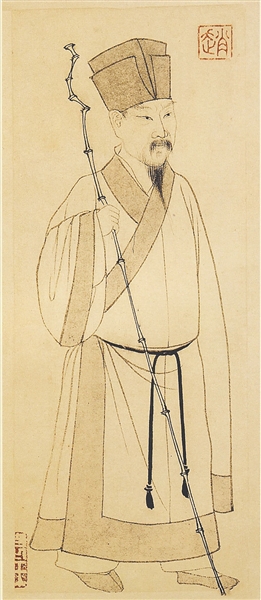 赵孟頫所绘东坡相貌清瘦、形象文雅,头戴学士帽,手持竹杖,体现了赵对苏轼及其人生的独到理解。这顶学士帽系苏轼自己设计,乌纱材质、筒高檐短,不像官帽那般威严,展现了文人的儒雅,因此受到人们的追捧,被称为“东坡帽”,以至于出现“人人皆戴子瞻帽”的盛况。这也是后来历朝历代画家、文人表现苏轼形象不可或缺的图像元素。林语堂名著《苏东坡传》就是以赵孟頫所绘《东坡像》作为扉页画。