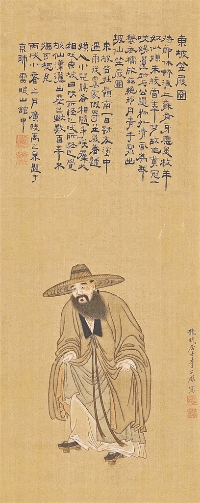 东坡谪居儋州三年,留下诸多故事。据说有一次他拜访黎子云,途中遇雨,于是找农户借斗笠、木屐而归,因搭配不协调,被不少妇女、儿童相随而笑。老朋友李公麟听说这个故事之后,便创作了《东坡笠屐图》。李的这幅画现已失传,但明朝朱之蕃的摹本却传承至今,影响深远。现代画家张大千也曾创作《东坡笠屐图》,并题款曰:“东坡笠屐图,仿元人任子明笔。辛巳六月朔一日,敦煌莫高窟作,蜀郡张大千爰。”张大千笔下的苏轼是美髯公,是模仿元代画家任仁发(字子明)的作品,而且极有可能受到了元杂剧《苏子瞻风雪贬黄州》的影响。在这部作品中,苏轼属于“末”角,因此需要装扮上大胡子,再配上大肚子。这是相关画作中另一种风格的东坡形象。