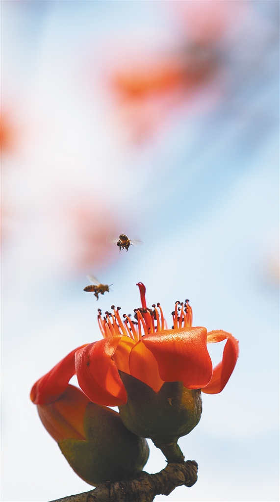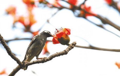 木棉“招蜂引蝶”的本事也不小,常常看到暗绿绣眼鸟、黄腹花蜜鸟等在它的枝头盘桓。这是因为木棉花开时花朵形似碗状,是小鸟们的“饭碗”。有研究表明,木棉花蜜产量非常大,一朵花每天能分泌5至10毫升的花蜜,花蜜的浓度不高,但是小鸟喜欢。除了花蜜,花朵里可能还有昆虫、雨水等,又充饥又解渴。暗绿绣眼鸟就是其中一种爱去吃木棉花蜜的小鸟,因此常在摄影作品里看到它们同框出现。