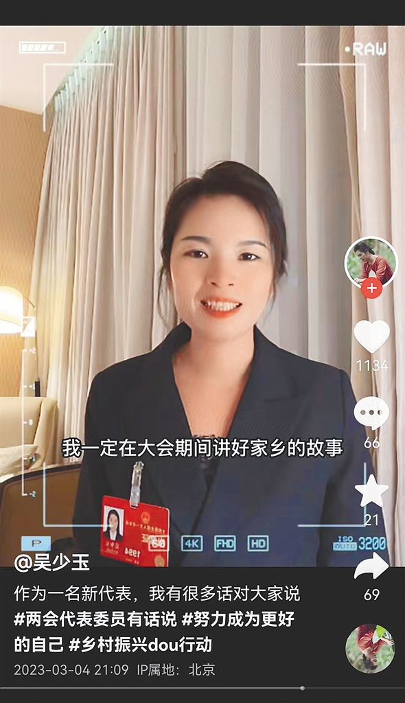 几年前,吴少玉尝试用抖音短视频,讲述家乡土法制糖的非遗文化、发展产业助力乡村振兴的故事,如今已经有了近3万粉丝。十四届全国人大一次会议开幕的前一晚,吴少玉怀着激动的心情,在住地房间内拍摄了一段短视频,讲述了自己赴京两天来的履职心得,表示出席此次大会,倍感使命光荣和责任重大,她将在大会期间讲好家乡故事,把更多基层声音和百姓热盼带到大会。截至3月6日晚,这条视频达到了102万人次的播放量。