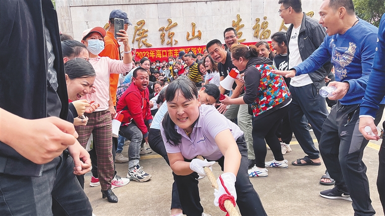 3月5日,为丰富社区群众文化生活,海口市琼山区府城街道办妇联开展2023年“喜庆国际妇女节 巾帼绽放自贸港”拔河比赛,迎接即将到来的“三八”国际妇女节。本报记者 张茂 摄