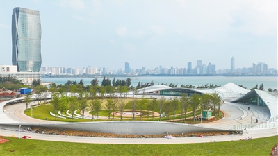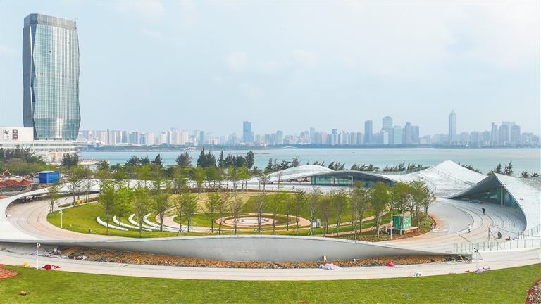 当天,记者在位于海甸岛美丽沙海岸西北处的海口湾6号高标准驿站——“天空之山”项目施工现场看到,整个建筑已初显真容,蜿蜒曲折的波浪形倾斜屋顶线条轻盈而柔和,而在屋顶缓坡之下,15片明亮的巨幕玻璃组成两个镂空设计的公共通道,提供了一片开放通透的共享空间。现场留有部分工人在对玻璃幕墙和屋面进行施工,并进行相关绿化工作。海口旅游文化投资控股集团有限公司6号站项目经理陈泽宾告诉记者,目前正在对驿站进行品质提升,整个工期计划本月下旬结束,本月底有望对外开放。