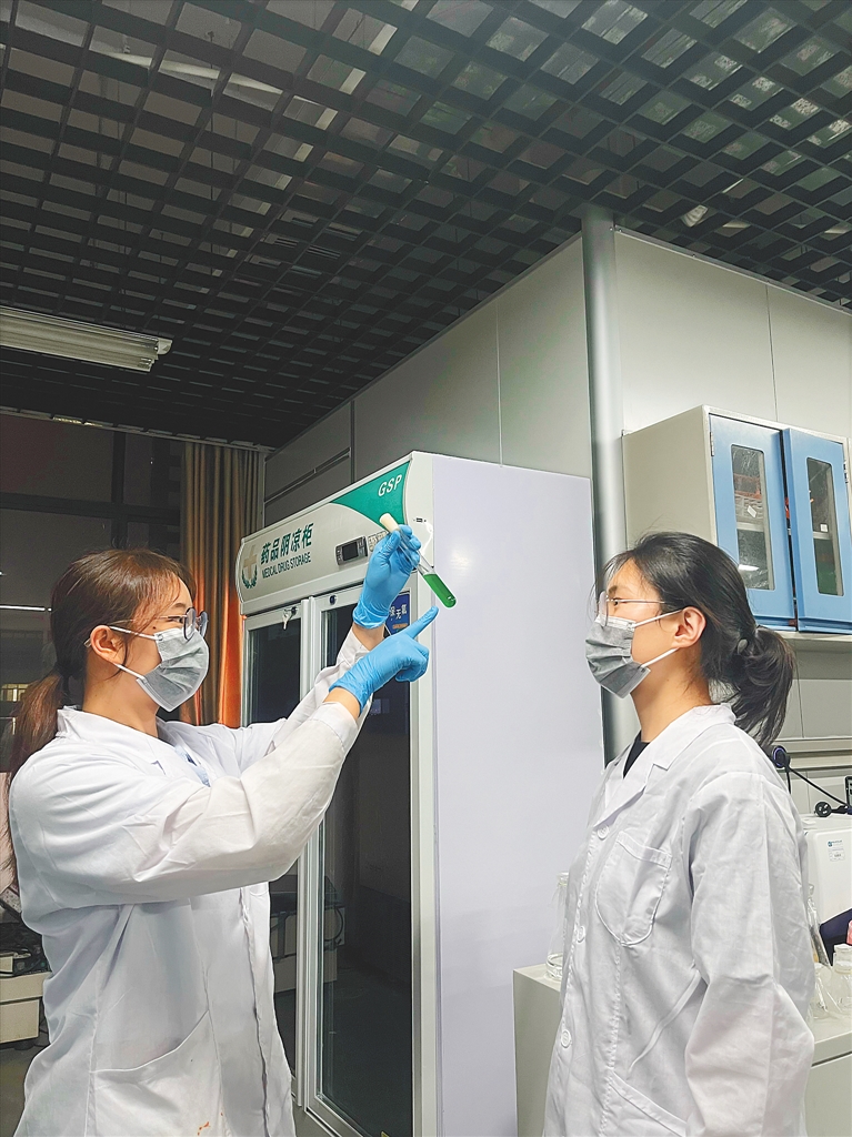 这是一张林桓指导的研究生们做实验的照片。实验室内,一位身穿白色实验服的女生向同伴展示手中的试管。“这张照片是今年春节期间一个晚上拍的,当时我的研究生们为了及时完成毕业设计,留在实验室里赶实验进度。”林桓说。