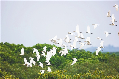在海南东寨港国家级自然保护区,各种鹭鸟在觅食、栖息。本报记者 宋国强 摄