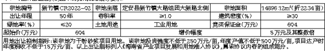 二、竞买申请人需具备的条件:中华人民共和国境内外的自然人、法人或其他组织均可申请参加竞买(注:失信被执行人不得参加本次竞买)。本次挂牌出让不接受联合申请,属境外的企业或其他组织的,须提供境外公证部门的公证书及法律规定的其他文件。具有下列行为竞买人不得参加本次土地出让挂牌:1.在定安县范围有拖欠土地出让金行为,并未及时改正的。2.在定安县范围有因自身原因造成闲置土地,并未及时纠正的。3.根据《海南省自然资源和规划厅关于加强土地供应竞买人资格审核的通知》(琼自然资函〔2020〕1753号)文件规定,原非法占地、违法建设行为人。竞买人必须一次性缴纳竞买保证金到定安县自然资源和规划局指定账户,也可依照《海南省自然资源和规划厅关于海南省土地交易市场竞买保证金可使用银行保函的通知》(琼自然资函〔2022〕7号)的规定使用银行保函方式提供土地竞买保证金,保函方式需在竞买保证金到账截止时间前2个工作日送达。三、本次国有建设用地使用权挂牌出让设有底价,按照出价最高且不低于底价者得的原则确定竞得人。四、本次挂牌出让的详细资料和具体要求,见挂牌出让文件。申请人可于2023年3月9日至2023年4月7日从海南省建设用地使用权和矿业权网上交易系统(以下简称网上交易系统,网址:http://lr.hainan.gov.cn:9002)查看和打印。并按挂牌出让手册的具体要求报名参加竞买。五、缴纳竞买保证金的截止时间为2023年4月7日17:00。经审核,申请人按规定缴纳竞买保证金,具备申请条件的,我局将在2023年4月7日17:30前确认其竞买资格。六、本次国有建设土地使用权挂牌出让活动在海南省政府会展楼二楼省公共资源交易服务中心土地交易厅进行, 地块挂牌时间为2023年3月31日8:30至2023年4月10日10:00。七、开发建设要求:1.该地块项目应使用装配式方式建造。2.开发建设期限:竞得人应自《国有建设用地使用权出让合同》签订之日起100天内动工,动工之日起540天内竣工,竣工之日视为投产,项目须在投产后360天内达产。竞得人未按出让合同约定时间动工及竣工的,每延期一日,应向出让人支付土地出让价款总额1‰的违约金。竞得人造成土地闲置,按照《海南自由贸易港闲置土地处置若干规定》执行。3.本次系带建筑设计方案挂牌出让,竞得人须严格按照《定安县新竹镇CR2022-02地块建筑工程规划设计方案 》执行。4.竞得人取得土地使用权后,应严格按照规划要求建设。涉及水务、绿化、市容、卫生、环境保护、消防安全、交通管理等的设计施工,应符合国家和海南省的有关管理规定。5.成交价款不包括有关税费,竞得人须按照规定到县税务部门缴纳契税、印花税等税费。八、其他需要公告的事项:1.竞得人须在签订《成交确认书》之日起10个工作日内与县自然资源和规划局签订《国有建设用地使用权出让合同》。2.竞买人须在竞买初审前与县塔岭工业园区管理委员会对接,完全知晓该宗地《海南省产业项目发展和用地准入协议》内容,并向县塔岭工业园区管理委员会出具书面承诺,如竞得该宗国有建设用地使用权,将严格按照该宗地《海南省产业项目发展和用地准入协议》规定的要求进行项目开发建设和经营管理。同时,竞买人须在签订出让合同时一并与县塔岭工业园区管理委员会签订《海南省产业项目发展和用地准入协议》,并严格按照《海南省产业项目发展和用地准入协议》约定内容进行开发建设,否则将承担相关违约责任。3.申请人竞得土地后,拟成立新公司进行开发建设的,竞得人在新公司中出资比例不得低于50%(不包含50%)。4.按正常工作时间(8:00—12:00,14:30—17:30)受理申请报名手续,节假日除外。5.本次挂牌出让事项如有变更,届时以变更公告为准。6.上述所有时间均为北京时间。九、查询网址:http://www.landchina.com/(中国土地市场网);http://zw.hainan.gov.cn/ggzy/;http://lr.hainan.gov.cn。十、咨询方式:咨询电话:0898-63822430 18976767729。联系人:王先生 孙女士。