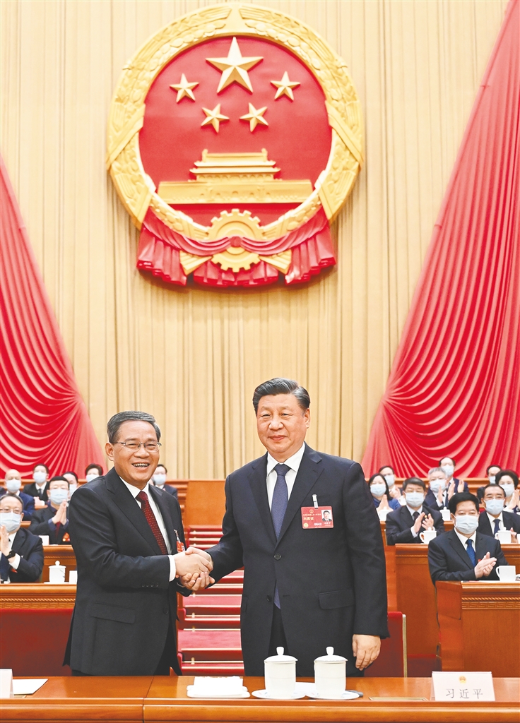 3月11日,十四届全国人大一次会议在北京人民大会堂举行第四次全体会议,根据国家主席习近平的提名,经过投票表决,决定李强为中华人民共和国国务院总理。这是习近平同李强握手。新华社记者 李学仁 摄