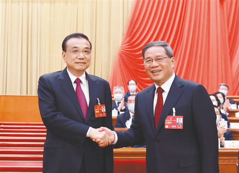 三月十一日,十四届全国人大一次会议在北京人民大会堂举行第四次全体会议,根据国家主席习近平的提名,经过投票表决,决定李强为中华人民共和国国务院总理。这是李强同李克强握手。新华社记者 黄敬文 摄